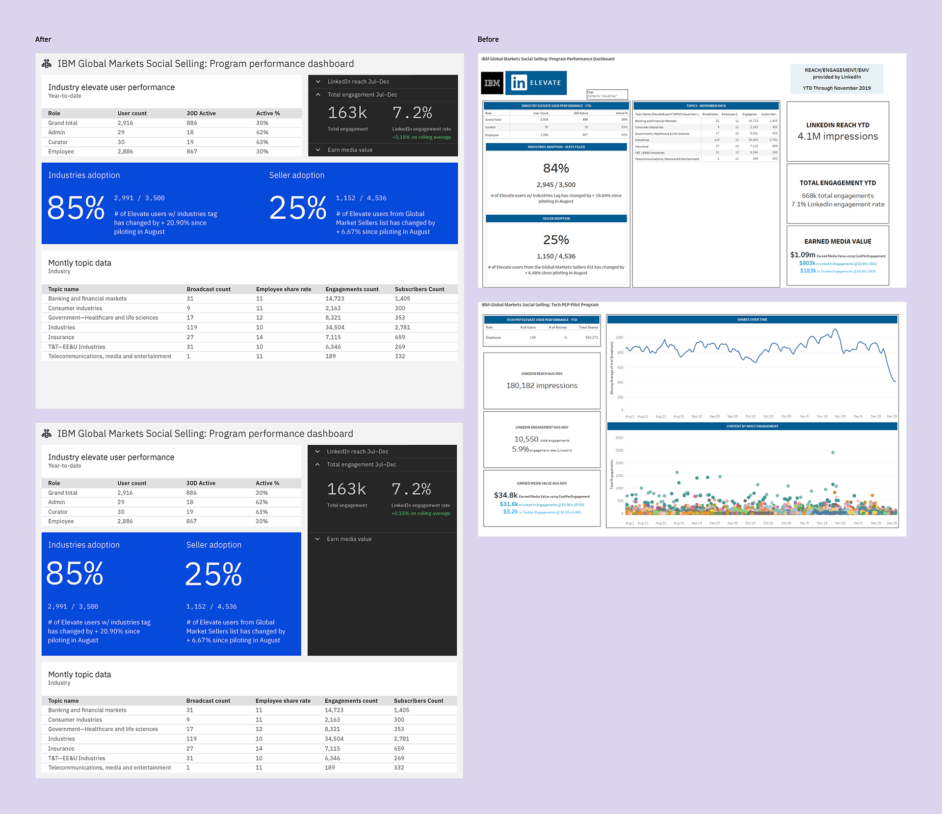 The UI redesign for LinkedIn's Elevate program performance dashboard for IBM Global Markets Social Selling focused on clarity and actionable insights.